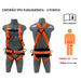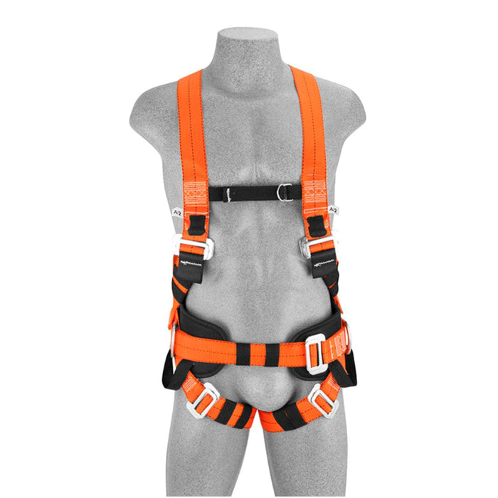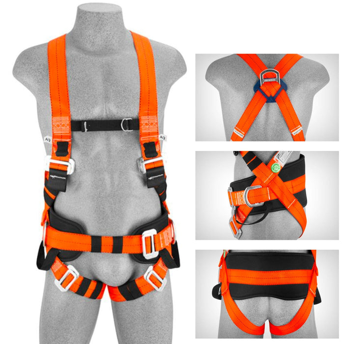 Possui 4 pontos de conexão, sendo 2 argolas em aço nas laterais para posicionamento, 1 argola em aço dorsal para retenção de queda e 1 ponto simultâneo pelas alças frontais em fita de poliester retenção de queda. Possui 2 fivelas em aço para regulagem do suspensório, 1 fivela em aço para regulagem da cintura, 2 fivelas em aço para regulagem das coxas e 1 fivela de metal para regulagem peitoral, com almofada na cintura, altura de 140mm e 800mm de comprimento. Com laudo aprovado para usuários até 140 Kg.