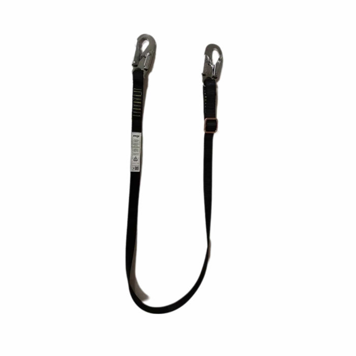 Talabarte de posicionamento/restrição em fita de poliéster de 25 mm, possui 2 conectores classe T em aço com abertura de 20 mm e anel de regulagem em aço. Comprimento regulável de 0,90 a 1,80 m.