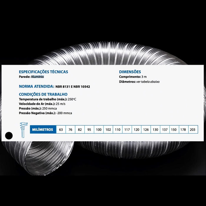 O duto semiflexível é indicado para utilização em coifa, churrasqueira, chaminé de aquecedores a gás e para sistemas de exaustão, exaustor de banheiro e ventilação em geral. Confeccionado em alumínio com dupla cravação para garantir a resistência e flexibilidade do duto. Os diâmetros disponíveis vão de 63 a 203 mm.