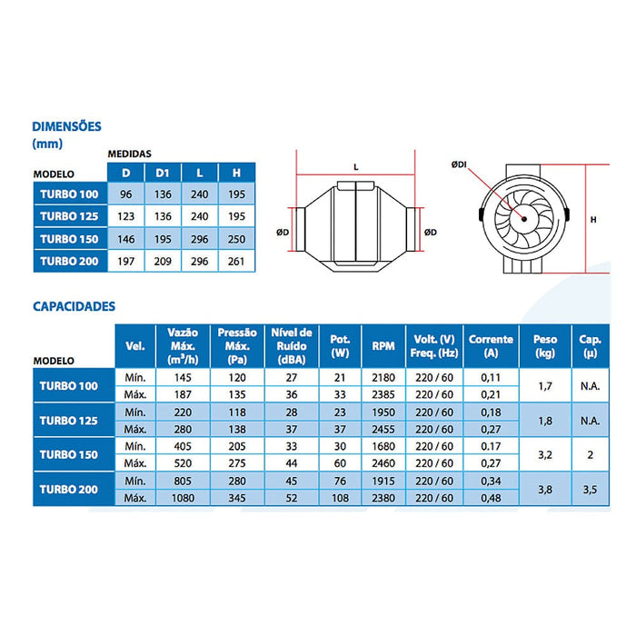 Turbo 125 – 345 m³/h - Para ambientes de até 18m²