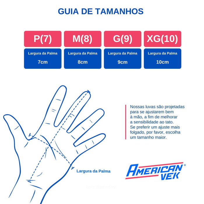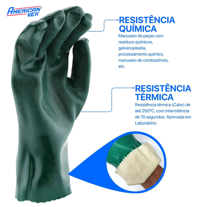 Luva de segurança confeccionada em suporte têxtil de algodão, revestimento externo em policloreto de vinila (PVC) e acabamento antiderrapante tipo areia, na região palmar, ponta dos dedos e dorso.