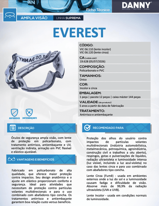 O modelo Óculos de Segurança Everest se encaixa bem ao rosto, mesmo em cabeças pequenas, e é possível a utilização de Óculos convencionais graudados por baixo. Óculos de Sobreposição.