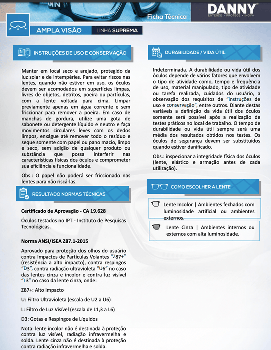 I) EPI não aprovado contra Infravermelho (R) e Soldagem e Processos Similares (W). II) EPI aprovado para a resistência a alto impacto, devendo apresentar a marcação "+" segundo a norma técnica ANSI/ISEA Z87.1-2015. Os óculos possuem essa marcação. III) Apresenta proteção contra respingos (D3).