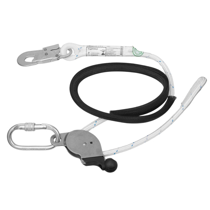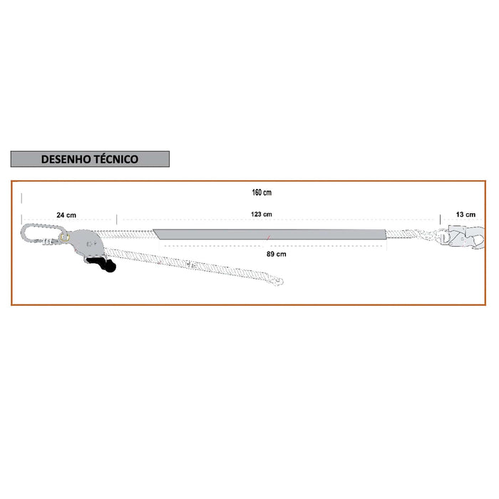 Possui em uma extremidade 01 conector em aço tipo gancho “Classe T”, com abertura de 20mm, dupla trava de segurança, com carga de ruptura > 22kN conforme norma ABNT NBR 15837:2020 e na outra extremidade possui um regulador de corda em aço com um conector “Classe B”, em aço, oval, com abertura de 17mm (+/-3) trava de segurança, conforme norma ABNT NBR 15837:2020.