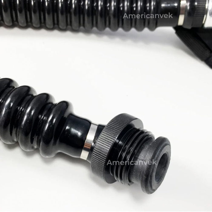 A traqueia é fabricada borracha natural preta de excelente qualidade. Sanfonada com aproximadamente 80cm de comprimento. Na parte inferior da traqueia há 1 peça em mat. tipo plástico, c/rosca presa à traqueia por abraçadeira metálica. Essa peça é rosqueada à válvula de fluxo contínuo e possui 1 atenuador de ruído na parte interna.