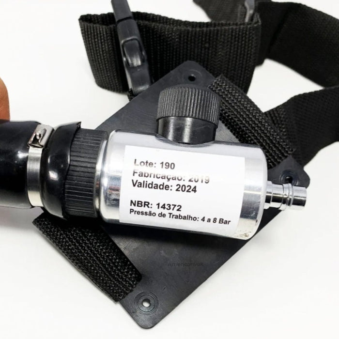 A válvula de fluxo contínuo possui, na lateral, 1 registro para controle da passagem de ar e, na parte inferior, um bico para acoplamento direto (engate rápido) à mangueira de suprimento de ar comprimido respirável. É dotada também, na lateral, de um dispositivo de borracha na cor preta, por onde passa 1 cinto abdominal ajustável, em poliéster, na cor preta, e possui 1 fivela plástica de ajuste rápido.
